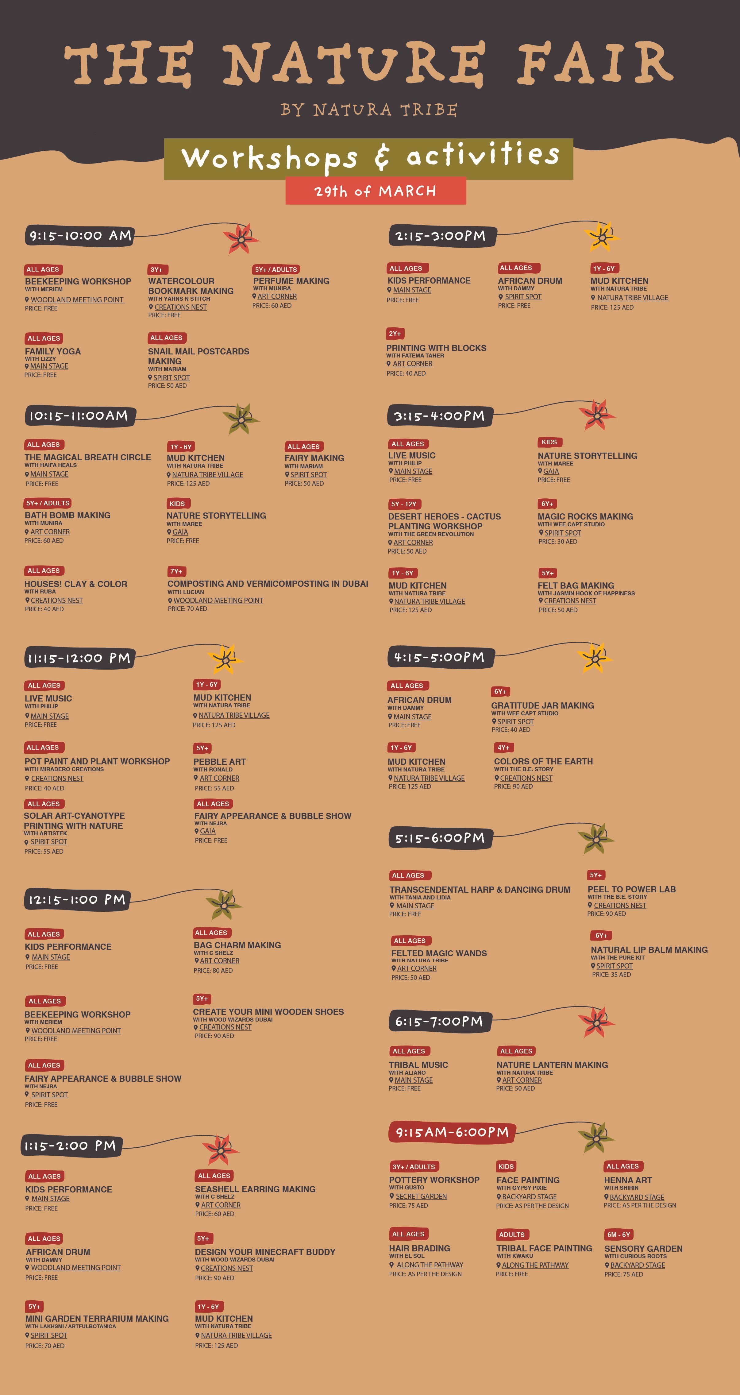 Take Part As visitor: Spend an unforgettable day surrounded by nature with your friends and family at the Nature Fair. This event is perfect for the little ones, allowing them to run freely as they explore the various offerings and activities available. The fair hosts over 50 activities and workshops designed for both kids and adults, all rooted in nature, and all for a nominal fee. Entry to the park is priced at 25 AED per person.